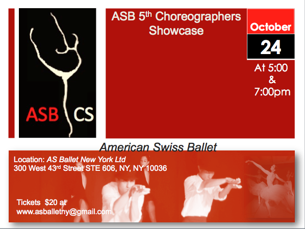 ASBCompaNY is stil accepting applications for the "5th Choreographers Showcase" on Saturday October 24th at 5pm & 7pm AS Ballet NY, 300 West 43rd Street SUITE 606.