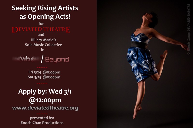 Enoch Chan Productions is looking for some of the top rising dance artists, emerging or established choreographers, to share the stage with DEVIATED THEATRE and Hillary-Marie's Sole Music Collective for performances on Friday 3/24/17 and Saturday 3/25/17 at Atlas Performing Arts Center! This is a remarkable opportunity to perform alongside some of the most cutting edge professional dancers in the Washington DC region while exposing your own work to new audiences!