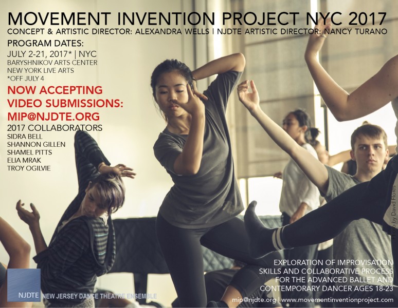 Video audition submissions are now being accepted for a very few remaining spaces in the MOVEMENT INVENTION PROJECT® (MIP®) 2017 NYC summer intensive. Email mip@njdte.org for more details today!