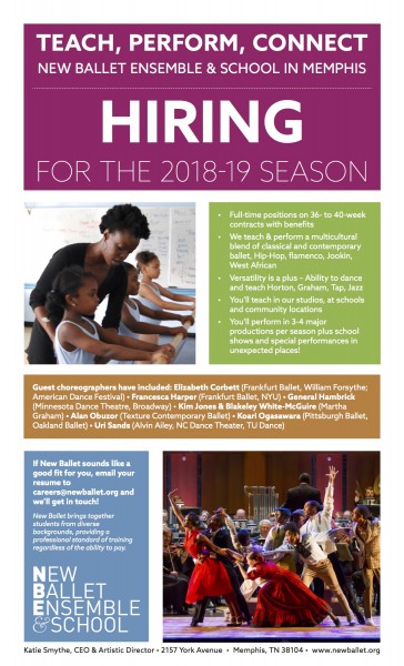 New Ballet Ensemble & School located in Memphis, TN is auditioning in New York City for full-time teaching and performing artists for the 2018-2019 season.