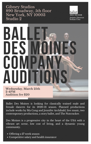Offering a 27 week season, competitive salary and health insurance. For questions, contact info@balletdesmoines.org.