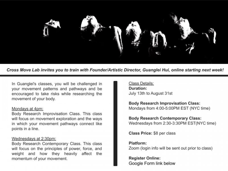 As studios remain closed, Cross Move Lab invites you to train with Founder/Artistic Director, Guanglei Hui, online starting next week!
