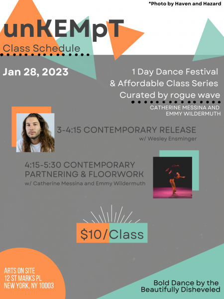 From 3 pm -4:15 pm Wesley Ensignmer will teach a Contemporary Release class, and from 4:15 pm -5:30 pm Catherine Messina and Emmy Wildermuth will teach a Contemporary Floorwork and Partnering Class. Classes will be held at Arts on Site. Follow @roguewaveroguewave on IG for more information.