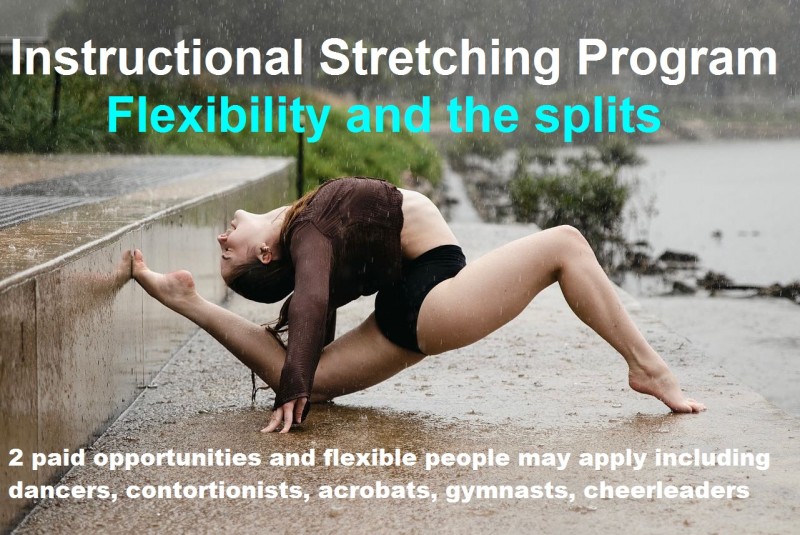 Seeking a flexible person to help create a step-by-step guide of 30 - 35 stretching exercises for dancers and gymnasts. Excellent leg flexibility and splits would be required and there are 4 or more hours offered. The position is open to everyone of any fitness discipline including skaters, contortionists, dancers, acrobats, cheerleaders, gymnasts or if you're just flexible in general. This role can be done remotely (work from home). Request an Information Pack to michaelp100@hotmail.com