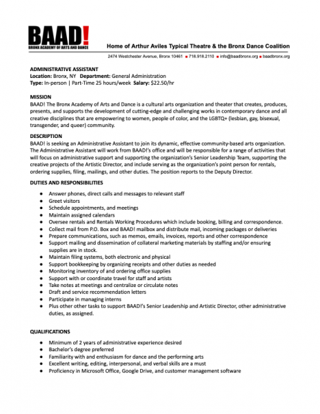 Administrative Assistant for BAAD! Bronx Academy of Arts and Dance