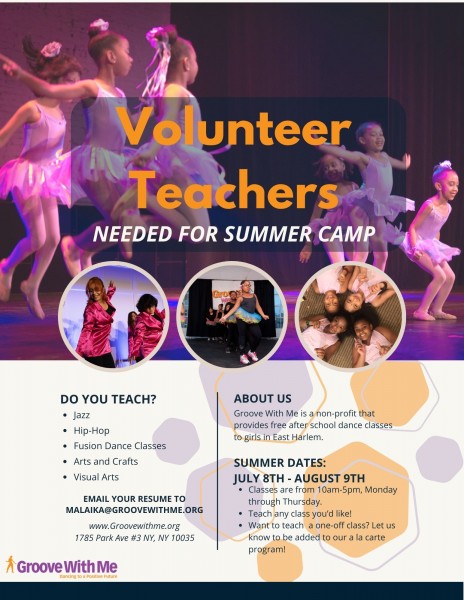 We are currently accepting applications for Volunteer Dance Teachers for our Summer Program (July 8th - August 9th) and for our September '25 School Year. Groove With Me is a free dance school for girls in East Harlem. It engages girls during the idle out-of-school hours when 90% of youth violence occurs; and seeks to decrease teen pregnancy, truancy, crime, violence, prostitution, substance abuse and gang related activity. East Harlem has the highest unmet need for after school programming of any neighborhood in NYC. By volunteering you provide much needed out-of-school time safety - and arts programming.