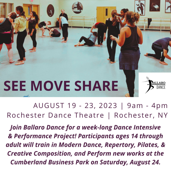 Join NYC-based Ballaro Dance for SEE MOVE SHARE: a week-long Summer Intensive & Performance Project for dancers ages 14 through adult hosted at Rochester Dance Theater in Rochester, NY.