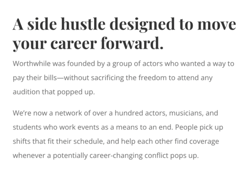 The Worthwhile promise is that you'll never miss an audition, callback, or paid acting work because of your job with us. You'll pick up shifts only on the days you feel like working, and you can call out for auditions up to the minute before your shift starts.