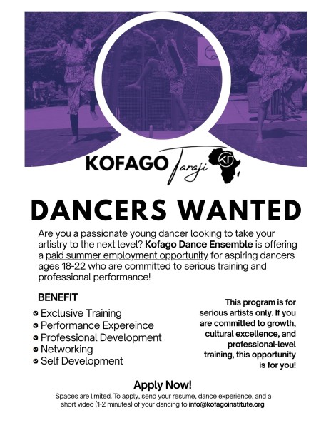 Spaces are limited. To apply, send your resume, dance experience, and a short video (1-2 minutes) of your dancing to theinstitute@kofagoinstitute.org.