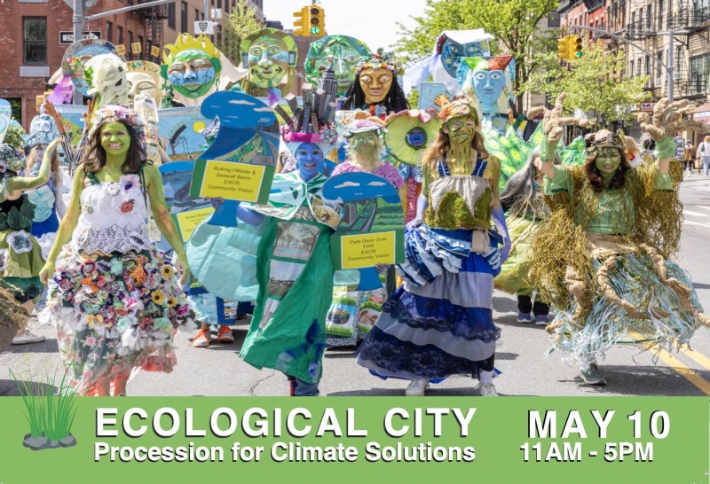 ECOLOGICAL CITY - Procession for Climate Solutions is an urban ecological pilgrimage and an art and climate action. Ecological City features a spectacular procession of visual art, giant puppets, costumes and 21 site performances celebrating climate solution initiatives throughout the community gardens, neighborhood and East River Park waterfront of the Lower East Side.