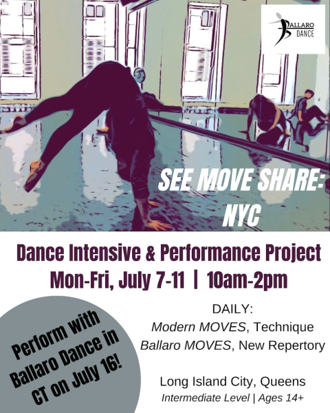 Ballaro Dance hosts its inaugural SEE MOVE SHARE: Dance Intensive & Performance Project in New York City this summer! Join the Company for daily classes & an original creative process; perform with the Company in CT at Aquila's Nest Vineyards!