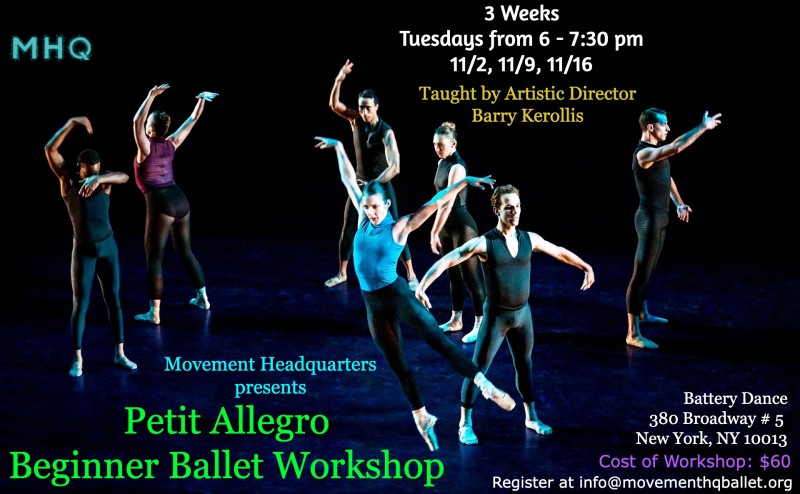 Movement Headquarters Ballet Company is offering a 3 week (see below for details) Petit Allegro beginner ballet workshop in November.