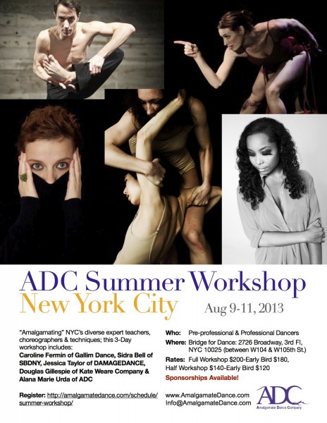 ADC CONTEMPORARY SUMMER WORKSHOP, NYC AUGUST 9-11, 2013 "Amalgamating" NYCs diverse expert teachers, choreographers and techniques; this 3 Day workshop features Caroline Fermin of GALLIM DANCE, Sidra Bell of SDBNY, Jessica Taylor of DAMAGEDANCE, Douglas Gillespie of KATE WEARE COMPANY & Alana Marie Urda of AMALGAMATE DANCE COMPANY. Designed for contemporary dancers who are passionate about expanding their artistry, technique, partnering, and improvisation skills. Opportunity to perform in culminating showcase. Registration = Affordability. WORKSHOP RATES: Full Workshop (7 Classes, 3 Rep Sessions, Perform in show) $200.00 Partial Workshop (7 Classes, No Rep Sessions, Attend Show) $140.00