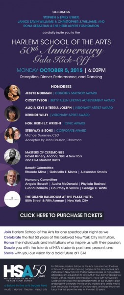 Join Harlem School of the Arts for one spectacular night as we celebrate the first 50 years of this beloved New York City institution, honor the individuals and institutions who inspire us with their passion, dazzle you with the talents of HSA students past and present, and share with you our vision for a bold future of HSA! Together we can enrich thousands of lives through the arts, one child at a time!
