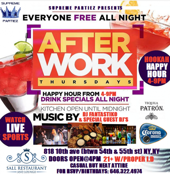 THURSDAYS AFTERWORK PARTY at SALL RESTAURANT & HOOKAH LOUNGE September 5th with NYC'S hottest dj's spinning the hottest music..