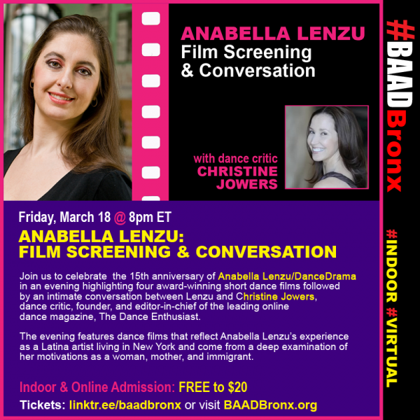 Join us to celebrate the 15th anniversary of Anabella Lenzu/DanceDrama on Friday, March 18th, 2022, at 8pm (NYC time) in a dance film evening IN-PERSON and ONLINE!