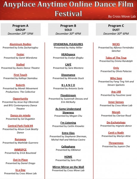 We are so happy to announce that the first edition of Anyplace Anytime Online Dance Film Festival will happen on December 29th and 30th with three different programs showcasing contemporary artist from seven countries!