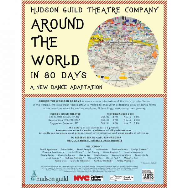 Hudson Guild Theatre Company presents a new, all-dancing adaptation of Around the World in 80 Days. This production features choreography by Matthew Westerby, who is returning for his sixth collaboration with the Company, and was conceived and directed by Jim Furlong, the Guild’s Director of Arts. The cast features eight dancers from the Matthew Westerby Company, and Jordan Elman, a gifted young actor, playing the role of Passepartout who narrates the story. Lighting Design is by Megan Peti, returning for her 13th year with the Company, with costumes by Charlotte Kreutz. The Projection Design by David Bengali features antique maps and artworks from five different continents.