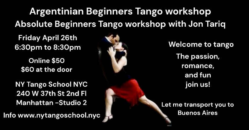 Beginners Tango Workshop with Jon Tariq. Friday April 26th, 6:30pm-8:30pm in midtown Manhattan, This 2-hour special workshop will move you up to the next level. no dance experience or partner necessary.Also Advance Beginners are welcome too! - Ladies are welcome to lead!! Online: $50 per person at the Door: $60 PP
