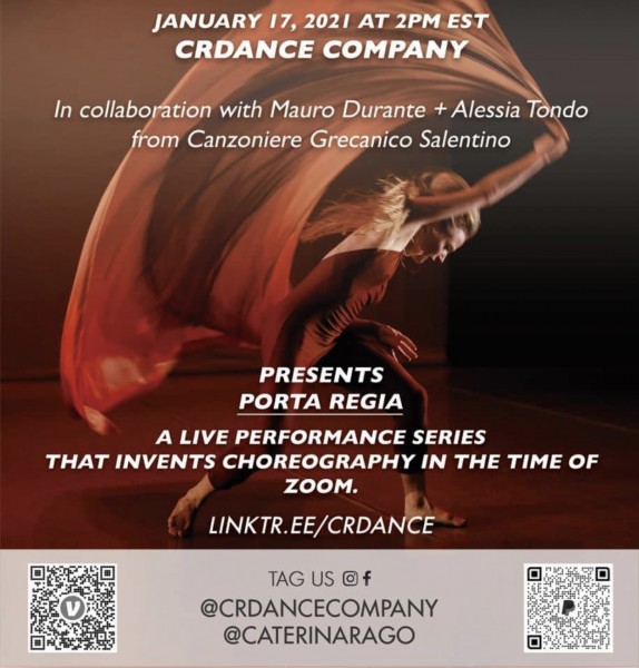PERFORMANCE 1: Live on Zoom. Featuring action excerpts from MORSO D’AMORE, a ballet that upends the classic tarantella —a dance rooted in the traditions of Southern Italy during the 15th to 17th centuries. In MORSO D’AMORE (“Bite of Love”), the dance is imagined as a state of ecstasy or rebellion. Hosted by Artistic Director Caterina Rago and Executive Director, Cheryl Kaplan, CRDANCE COMPANY will perform in collaboration with live music from Musical Director Mauro Durante and singer Alessia Tondo of Canzoniere Grecanico Salentino. The music prods the audience to enter into the choreography’s moment-to-moment volatility as dancers and audience work their way out of the demonic fate that befalls Morso D’Amore.