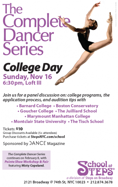 Sponsored by Dance Magazine. College Day is Part I of the Complete Dancer Series, designed to broaden the dance education of students by including resources and guidance on issues including pointe shoe fitting and foot care, physical therapy, nutrition, emotional wellness, and other supplemental services. 2015 Events: Pointe Shoe Workshop & Fair and Injury Prevention Workshop.