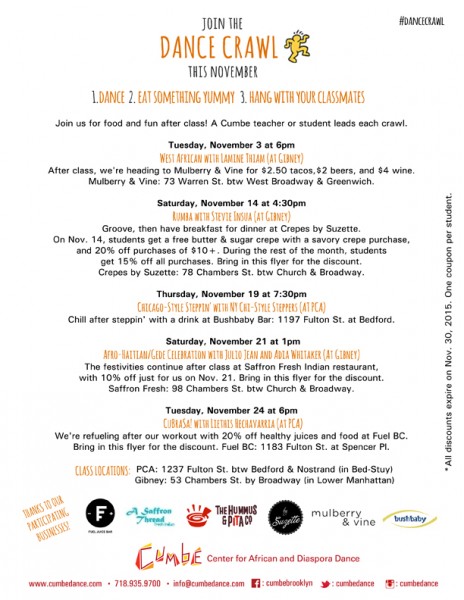 Presently we have Dance Crawl events scheduled for the 3rd, 14th, 19th, 21st, and the 24th. Check online at http://www.cumbedance.com/dance-crawl-november-2015/ as we may be adding more dance crawl events through out the month.