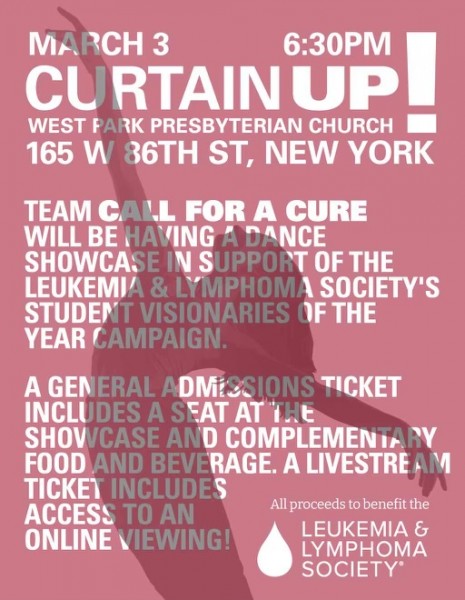 Join us for one night only, for a night of joy, artistry and pure inspiration. Team Call For A Cure hopes that you will support them in their Leukemia & Lymphoma Society’s Student Visionaries of the Year Campaign. All proceeds from this event will go to LLS so they can continue their mission of building a future without blood cancers. Performances by Broadway Dance Center's AIM Company, Niki Saludez, Katie Drablos, Melodye Redding, and Call for A Cure Team Members.