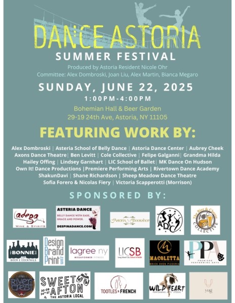 Dance Astoria is excited to bring back our summer festival at Bohemian Hall & Beer Garden. This year, the event is indoors with a great line up of performances made up of Queens based choreographers/performers. Produced by Astoria resident Nicole Ohr and commitee members Alex Dombroski, Joan Liu, Alex Martin, and Bianca Megaro, Dance Astoria is a family friendly event that includes dance performances of various genres, supported by local sponsors. Come enjoy art with some great food/drink!