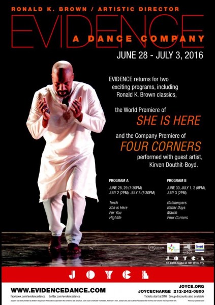Tickets start at $10! Performance schedule: Tue-Wed 7:30pm; Thu-Fri 8pm; Sat 2pm & 8pm; Sun 2pm & 7:30pm. For tickets call JoyceCharge at 212-242-0800. For more information, visit joyce.org & evidencedance.com. The Joyce Theater is located at 175 Eighth Avenue at 19th Street.