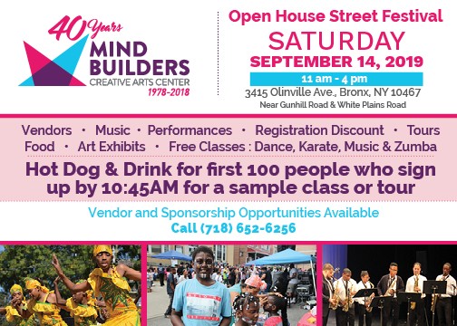 Mind-Builders Creative Arts Center at 3415 Olinville Ave in the Bronx NY, invites children, teens and adults to our annual Open House Street Festival on Saturday September 14th 2019 from 11AM-4PM. The festival offers a great opportunity to try out classes, learn about registration and scholarships, and have fun. Mind-Builders now serves over 600 students from three years old to senior citizens, specializing in dance, music, theatre, folk culture and martial arts classes. This year the festival will showcase student performances, food from local restaurants, music and more. There will be free classes, games and prizes all day long. Visitors are invited to try sample classes throughout the day and receive a 10% discount on registration for fall classes. Tours of Mind-Builders beautiful facility will include information on the rare African Art and coming events for the community. Everyone is welcome. Mind-Builders is a nonprofit 501(c)3 tax exempt organization.