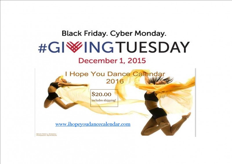 #GivingTuesday Please consider purchasing our 2016 Calendar from the I Hope You Dance, Inc. Dance Scholarship Fund on Giving Tuesday, December 1, 2015. Our calendars features NYC Dance Professionals which were each paired with a photographer famous for their dance photography. Featured dancers, Kat Wildish, Karen L. Arceneax, Sue Samuels, The Hip Hop Dance Conservatory with Safi Thomas, Aries in Flight with Catherine Mancuso, Acrobat Keith Milkas, Peg Moore-Maioriello/Metropolidance, Founder, Emily Bendler along with promising Pre-Professionals in many dance genres! Photographers include Rachel Nevell, Anna Kazuma of the AK47 Division, Irene Aviles of Irene Aviles Photography, Kyle Froman of Kyle Froman Photography and more! Only $20.00 postage included.