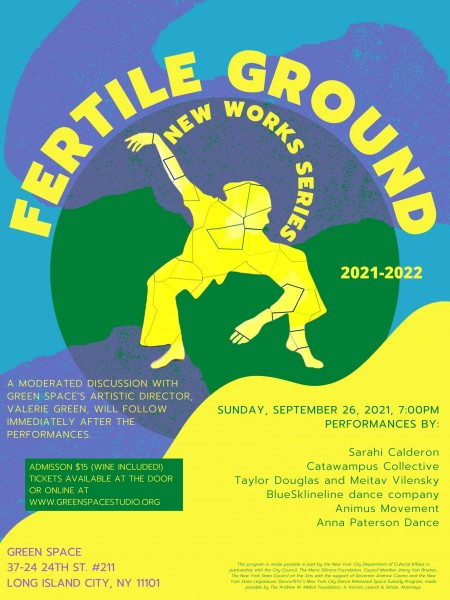 FERTILE GROUND has supported emerging and established artists for 14 seasons, showcasing the work of over 50 choreographers each year. The non-curated program features six dance makers each evening and includes a post-performance discussion with wine, moderated by Green Space’s Artistic Director, Valerie Green.