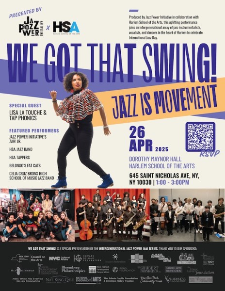 Inwood, New York (April 17, 2025)…For the third year in a row, Jazz Power Initiative (JPI) will partner with the Harlem School of the Arts (HSA) on We Got That Swing a celebration of Jazz Appreciation Month. The event will take place on April 26th, in Dorothy Maynor Hall (645 St. Nicholas Avenue) at HSA.