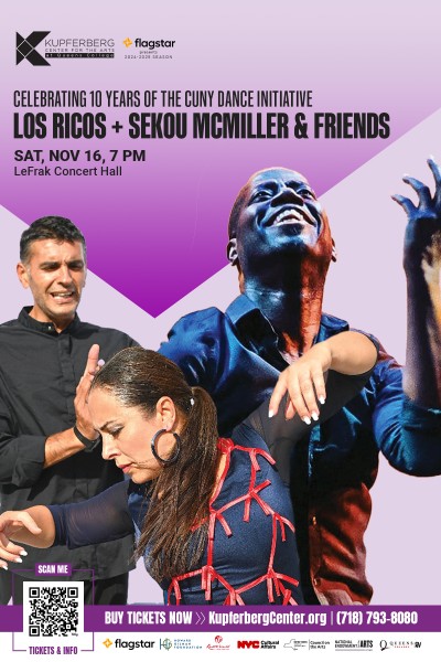Join us for an electrifying double-bill dance performance with live music as we celebrate the 10th anniversary of the CUNY Dance Initiative! Experience two alumni of this groundbreaking residency program: Los Ricos, featuring flamenco powerhouses Sonia Olla & Ismael Fernández, and Sekou McMiller, a leader in the Afro-Latin dance movement, along with his ensemble of six dancers and six musicians.