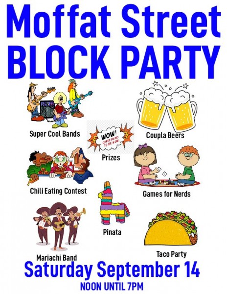 Saturday, September 14th on Moffat street between Knickerbocker & Irving Avs, any and all are welcome! They’ll be local, eclectic bands of all varieties, homemade Mexican food and drink, games (dominos, volleyball, eating contests) and fun prizes for everyone.