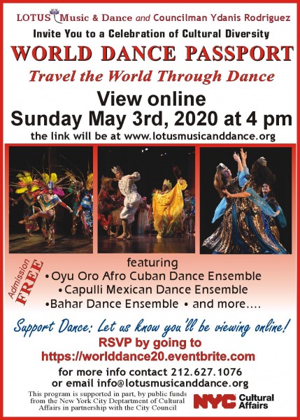 The World Dance Passport Event is scheduled on Sunday, May 3, 2020 at 4pm. This event will be online. You can go to www.lotusmusicanddance.org to view the video.