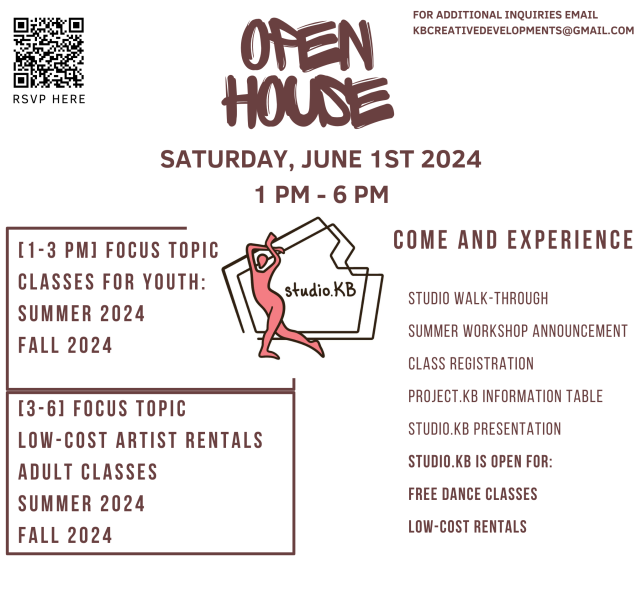 I am thrilled to finally invite you to the Studio.KB Open House on Saturday, June 1st, 2024, from 1 PM to 6 PM. This event is an excellent opportunity to introduce you to our new space, explore our offerings, participate in informative sessions, and connect with the Brownsville community.