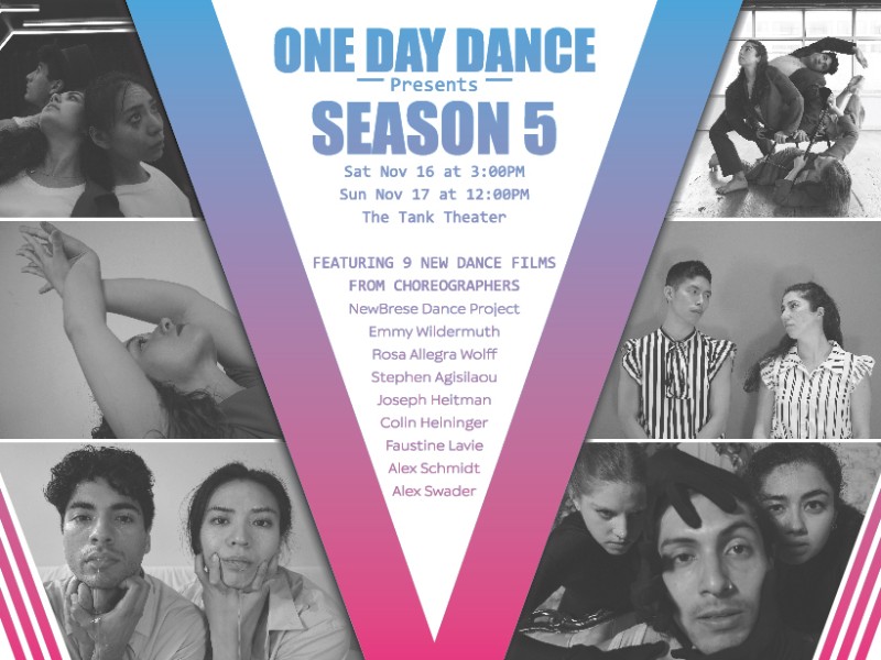 Join One Day Dance for our 5th season of dance on camera! This year we are premiering nine original films from an array of incredible choreographers selected by the cast of One Day Dance. From the first rehearsal to the finished product, each film is crafted within a non-consecutive 24 hours time frame. Through this economical time structure we challenge our guest choreographers to reach new levels in their creative process. Join us for this awesome evening!