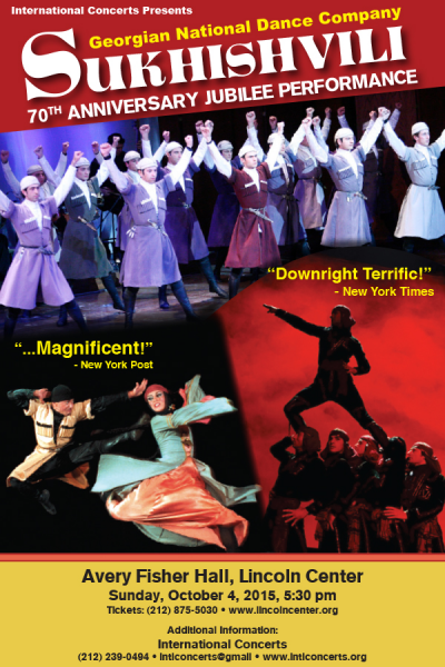 Sukhishvili is recipient of the "Best Show on Broadway" for its limited run. It has received a gold medal from Queen Elizabeth and sold out its performance at Lincoln Center four years ago, it was also the headline attraction for the George Balanchine Centennial with New York City Ballet. It has performed at the Metropolitan Opera and at primary venues in 57 countries to standing ovations. International Concerts was honored by Mayor Bloomberg and Former Brooklyn Borough President, Marty Markowitz for its cultural contributions to the community. Please see our website at www.intlconcerts.org for more information, videos and photos.