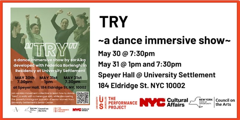 Blurring the lines between audience and performer, “TRY” invites viewers to not just witness, but to dance, feel, and connect. Set within an intimate, participatory environment, the performance draws from the real-life experiences of immigrant senior women from University Settlement’s Senior Center. Through shared moments of dance, dominos, and storytelling, their powerful journeys take center stage.