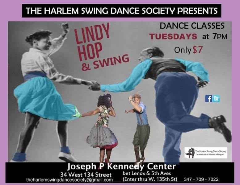 oin us at 7pm for only $7 for ADULTS - FREE for 18yrs and younger! NO partner necessary: On TUESDAYS Swing in Harlem: Lindy Hop and Swing Back with us for some Harlem Swing Dance fun....join us to see how it's done! Lessons for an hour and get the basics and your social dance groove going with the Harlem village's most famous dance of Lindy Hop. Have comfortable shoes and sneakers - and a bottle of water handy. Cash only at the door, and after class stay to practice a little and mingle :>)