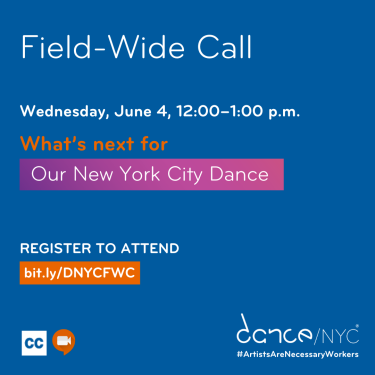 Accessibility: CART captioning will be provided. ASL interpretation and additional accessibility services are available upon request with registration up to 24 hours in advance of the meeting, or by emailing research@dance.nyc. Dance/NYC will try to accommodate requests made after this deadline, but cannot guarantee the availability of access providers less than 24 hours prior to the event. Calls will be primarily discussion and presentation based with sporadic use of videos and/or slides. Attendees will interact via the chat functions or via video and audio presence on Zoom.